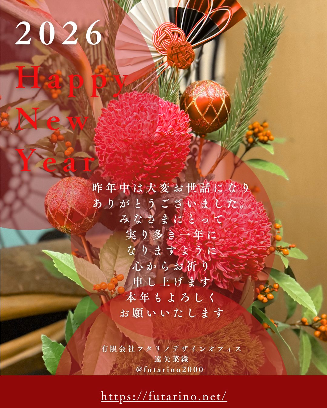 2026年 新年のご挨拶 2026.01.01ご挨拶 新年あけましておめでとうございます。 昨年は、大変お世話になりありがとうございました。 本年もどうぞよろしくお願いいたします。 本年も笑顔あふれる一年となりますように。 Tweet Share Pin it 投稿者: futarino ご挨拶 オフィス環境診断士, フタリノデザインオフィス, ルームスタイリスト, 整理収納アドバイザー, 遠矢菜織 コメント: 0 2025年 年末のご挨拶 関連記事一覧 2022年~2023年 年末年始のお休み 2025年 年末のご挨拶 2024年 あけましておめでとうございます 2025年新年のご挨拶 2023年~2024年 年末年始 休業日のお知らせ 謹んで新年のご挨拶申し上げます 年末年始のお知らせ 残暑お見舞い申し上げます 2024年年末年始のご挨拶