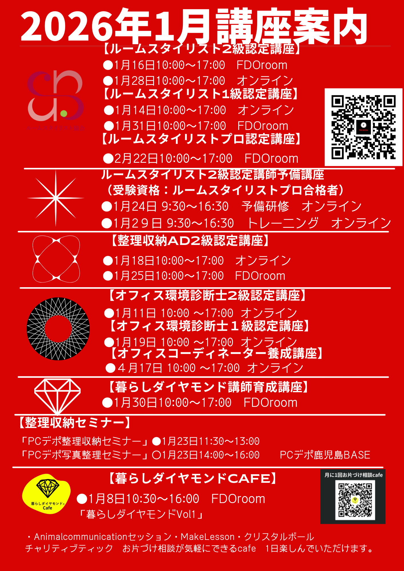 2026年1月講座のおしらせ 2026.02.02 Tweet Share Pin it 投稿者: futarino コメント: 0 関連記事一覧 暮らしダイヤモンド講師育成講座のご案内 11月講座のお知らせ 2022年12月講座 1月講座のお知らせ 6月2日・3日Heartfulchange Final 10月講座のお知らせ 暮らしダイヤモンド講座 4月講座案内 オトナの習い事“お片づけレッスン オンラインZoom